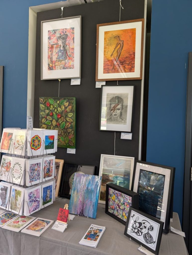 As we reflected after a lovely day we realised the wider effect of getting Centrepieces out into the community. As a result of the day we expect at least three people to contact to either join as artists or to volunteer. The band of volunteers all experienced a role engaging the public and valuing our art and organisation. We worked collaboratively and set up an amazing stand, took it down and all went for a cup of tea afterwards, bonded and triumphant. During the day, and in response to the excellent social media produced by Carla, three members of CP came over to see what was happening and supported the volunteers and also received support from them. A member who has not been for a while came with their mother who was trying to encourage them to re-engage with CP. A new trustee responded to the social media and came and met us all, saw the art and was enthused by our presence at the Art Fair and we all enjoyed a group selfie! We loved engaging with the Trustee, it makes us whole as an organisation. A young artist who has just graduated openly discussed their mental health and I was able to signpost them to SANE arts funding. We all engaged with other artists looking at their work and discussing techniques and effects.