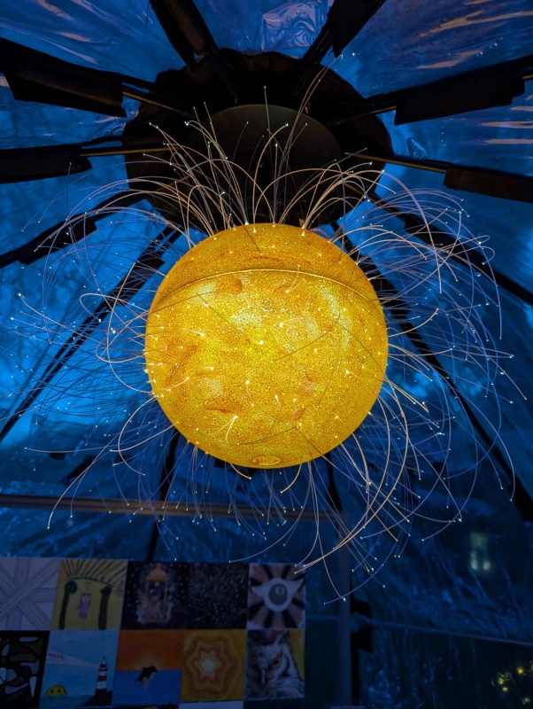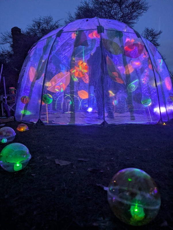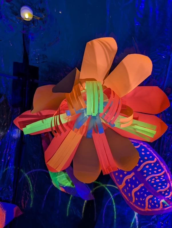• The Fluorescent Dome: People decorated a magnificent dome with fluorescent painted leaves, adding them to giant flowers created in prior workshops to build a glowing, neon garden.